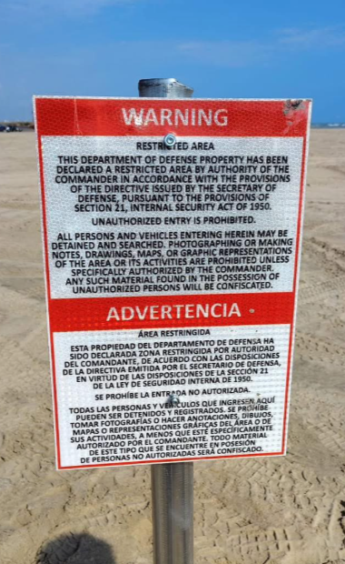 “Peligro. Área restringida. Esta propiedad del Departamento de Defensa ha sido declarada área restringida por las autoridades de acuerdo por autoridad del comandante (…) Se prohibe la entrada no autorizada. Todas las personas que ingresen pueden ser detenidas y registradas”, señalaban los carteles escritos en inglés y en español. Aparentemente, personal no identificado de EE.UU. los instaló en Playa Bagdad, ubicada en el estado de Tamaulipas, fronterizo con Texas.