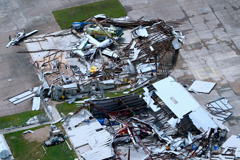 El hangar de un avión es destruido el jueves 27 de agosto de 2020, después de que el huracán Laura atravesó el área cerca de Lake Charles, Luisiana (AP Photo / David J. Phillip)
