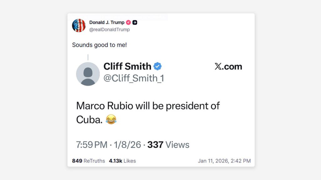 Donald Trump reaccionó al comentario de un internauta que vaticinó que el secretario de Estado de EE.UU., Marco Rubio, “será el presidente de Cuba”, en medio de las amenazas de la Casa Blanca a la isla tras la operación militar en Venezuela que concluyó con el secuestro de Nicolás Maduro.