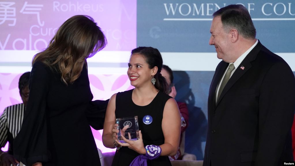 La primera dama de EE.UU., Melania Trump, y el secretario de Estado, Mike Pompeo, entregan el Premio Internacional a las Mujeres de Coraje a la activista nicaragüense Amaya Coppens.