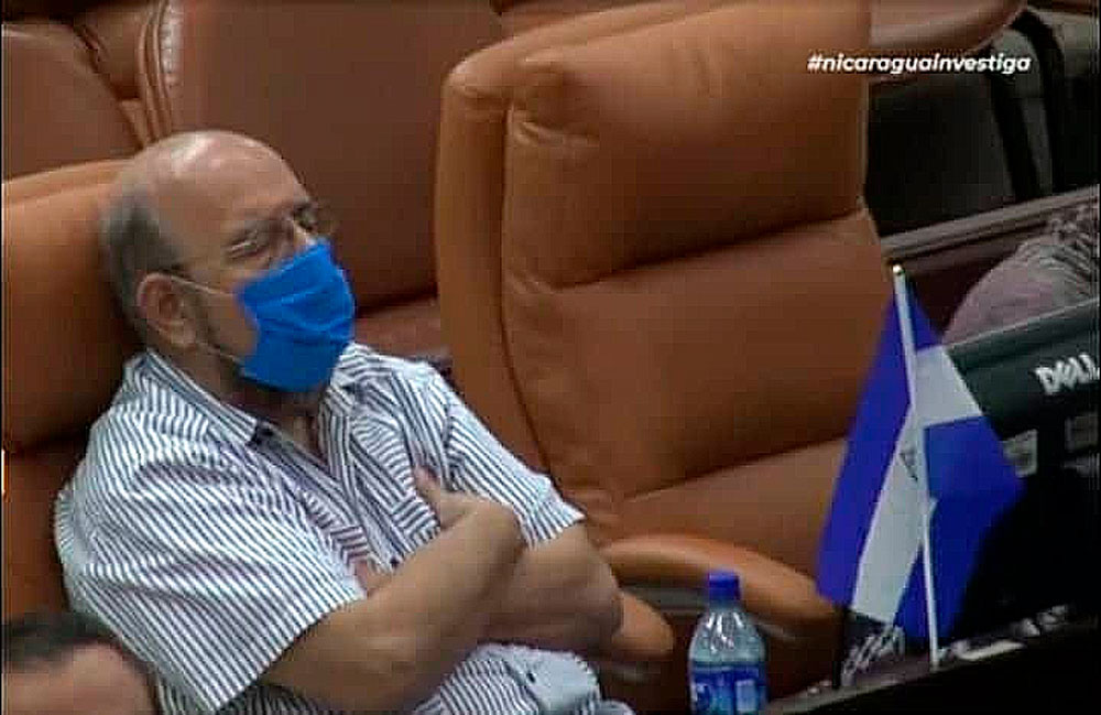 El diputado sandinista Edwin Castro se burló de las personas que portaban mascarillas. Ayer no se la despegó para nada en la Asamblea Nacional.