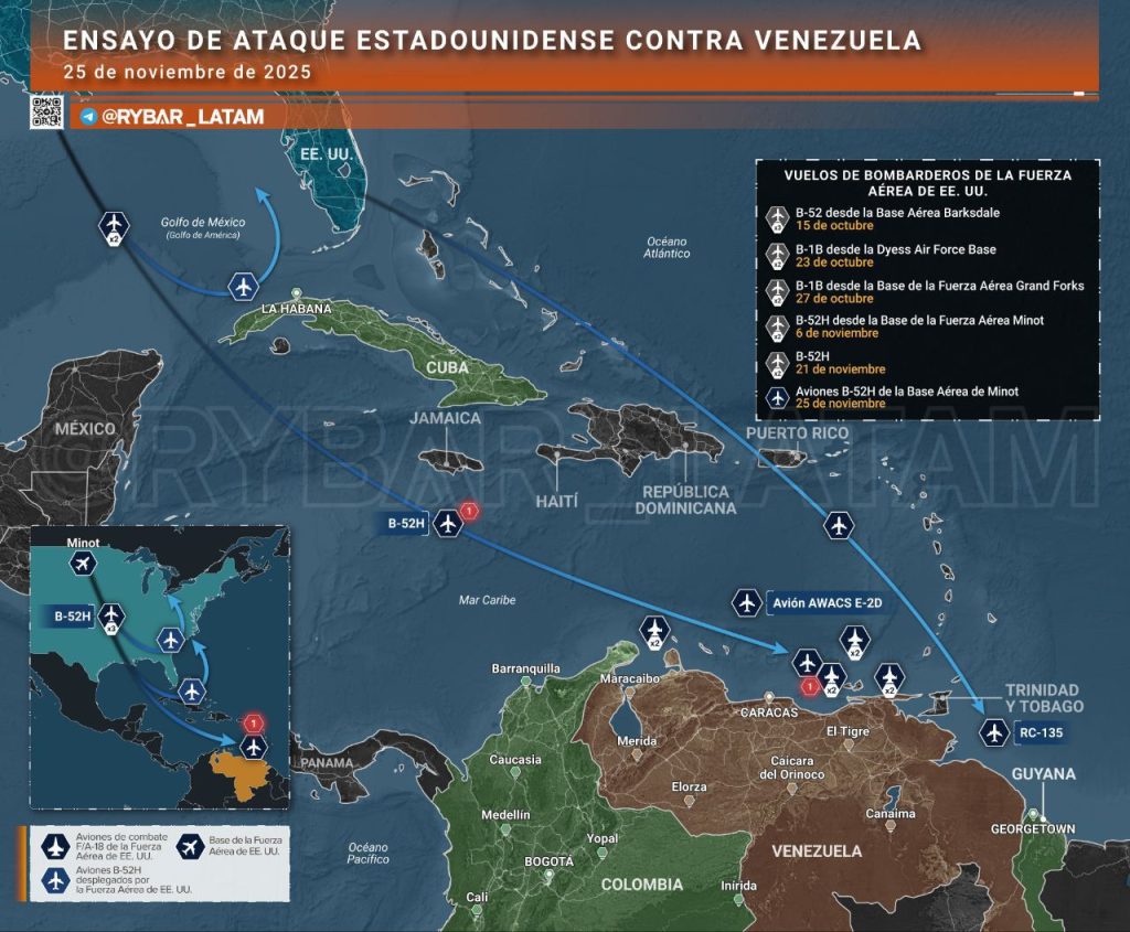 ➡️ De los tres B-52H que despegaron de la base de Minot rumbo a las costas venezolanas, solo uno llegó a su destino. Uno de los aviones de apoyo regresó antes de entrar al Caribe, y otro sufrió un fallo técnico en ruta.