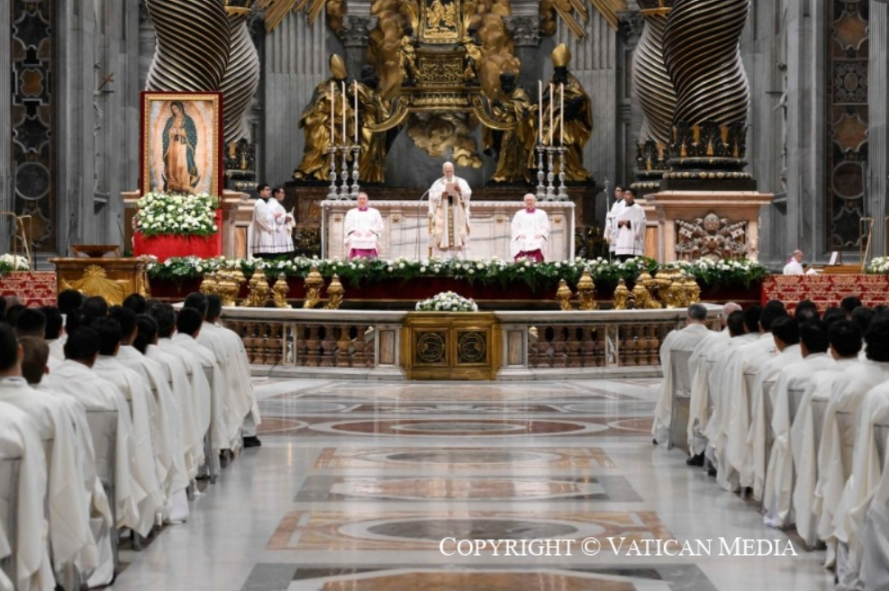 El Papa León XIV durante la misa en honorr a la Virgen de Guadalupe. Foto Vatican Media.