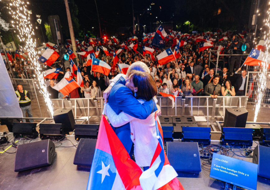 Tras el triunfo en las elecciones, Kast festejó con su esposa y seguidores.
