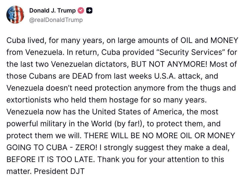 “No habrá más petróleo ni dinero para Cuba. ¡Cero! Les recomiendo encarecidamente que lleguen a un acuerdo antes de que sea demasiado tarde”, escribió Trump en la red Truth Social.