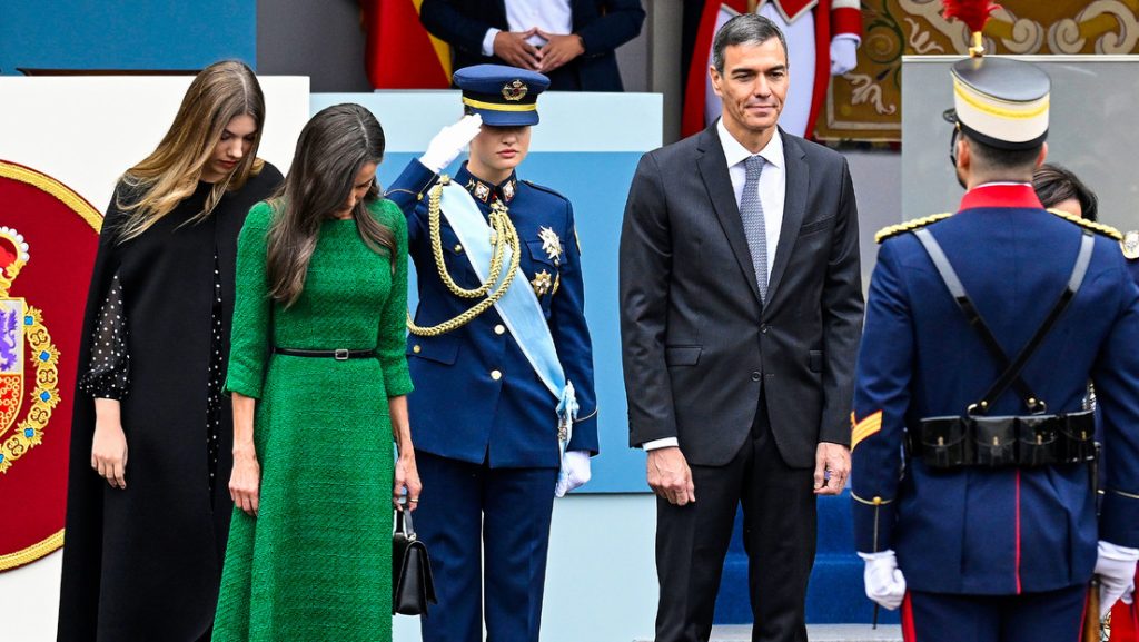 La princesa Sofía, la reina Letizia, la princesa Leonor y Pedro Sánchez durante el desfile militar por el Día de la Hispanidad, Madrid (España), el 12 de octubre de 2025.