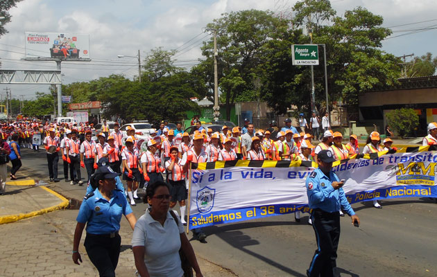 Organizaciones, estudiantes, y población en general marchan desde la rotonda El Periodista hasta el complejo policial Faustino Ruiz en apoyo a la conmemoración del 36 aniversario de la Policía Nacional.Fotos F. ReyesLa Policía Nacional realizó una Campaña de Educación Vial, con el respaldo de diferentes organizaciones, así como de estudiantes de diferentes colegios, con el objetivo de concientizar a los conductores a que manejen sus vehículos de una manera responsable, para reducir más el índice de muertes y accidentes que se han venido registrando en lo que va del año 2015.