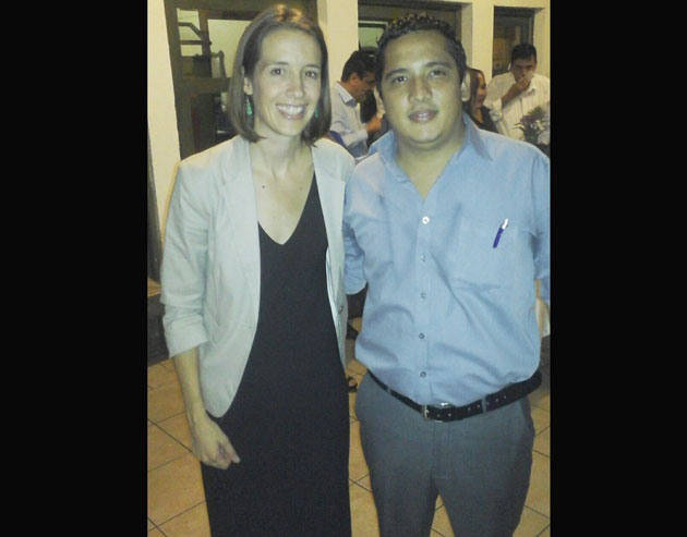 Ayer fueron presentadas a la prensa nacional dos nuevas funcionarias que estarán trabajando en la Embajada EEUU en Nicaragua, ellas son la nueva Agregada de Prensa Erin Markley (sonriendo) y Lisa Swernarski de Herrera, que será Consejera para Asuntos Públicos (a la derecha de Markley). En la foto el Periodista Juan Arévalo de La Jornada junto a Erin Markley, nueva Agregada de Prensa en la Embajada de EEUU.