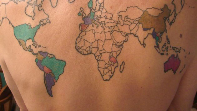 Bill Passman, abogado de Louisiana, se ha hecho un Mapamundi y tatuado los países por los que ha estado. En la gráfica se puede apreciar dónde. La mayoría que lo conocen le dicen que es una gran idea hacerlo.